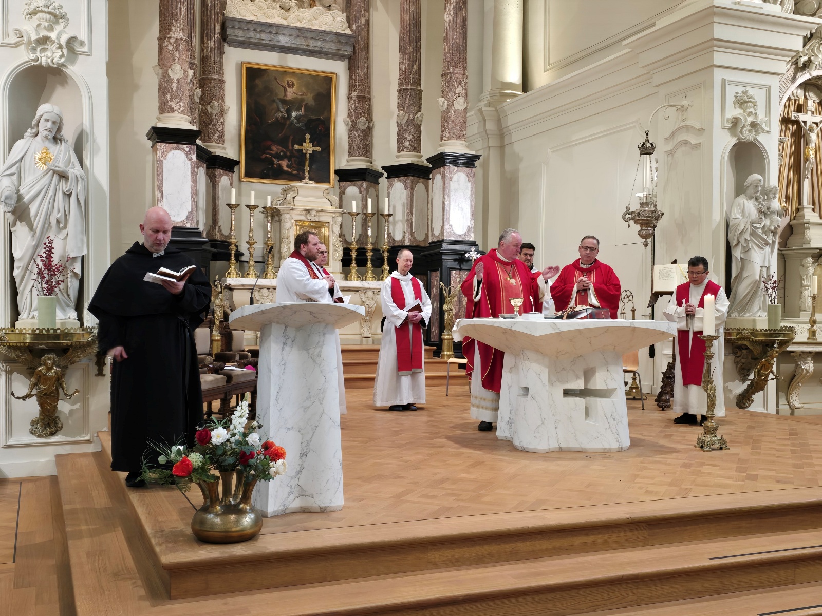Om 12.00 uur vierden de religieuzen met de andere gelovigen in de St. Augustinuskerk de dagelijkse Mis met als celebrant mgr. Hoogenboom en als concelebranten mgr. Woorts en diverse priester-religieuzen. Mgr. Hoogenboom wees in zijn inleidend woord op het bijzondere karakter van de dag: “Vandaag, 3 februari, is in twee opzichten een bijzondere dag. We vieren de gedachtenis van de heilige Blasius van Sebaste, in de vierde eeuw bisschop en martelaar in Armenië die in de traditie wordt aangeroepen als voorspreker voor gezondheid en bescherming, vooral tegen keelziekten. (…) Maar het is vandaag ook om een andere reden een bijzondere dag. Gisteren, op 2 februari, vierde de Kerk het feest van de ‘Opdracht van de Heer’ (Maria Lichtmis). In 1997 heeft de heilige paus Johannes Paulus II bepaald dat daags daarna de ‘Werelddag voor het Godgewijde Leven’ wordt gevierd. Een dag waarop we stilstaan bij de rijkdom van het Godgewijde leven, ook in ons aartsbisdom: mannen en vrouwen die door hun religieuze geloften een teken zijn van Gods liefde in de wereld.”