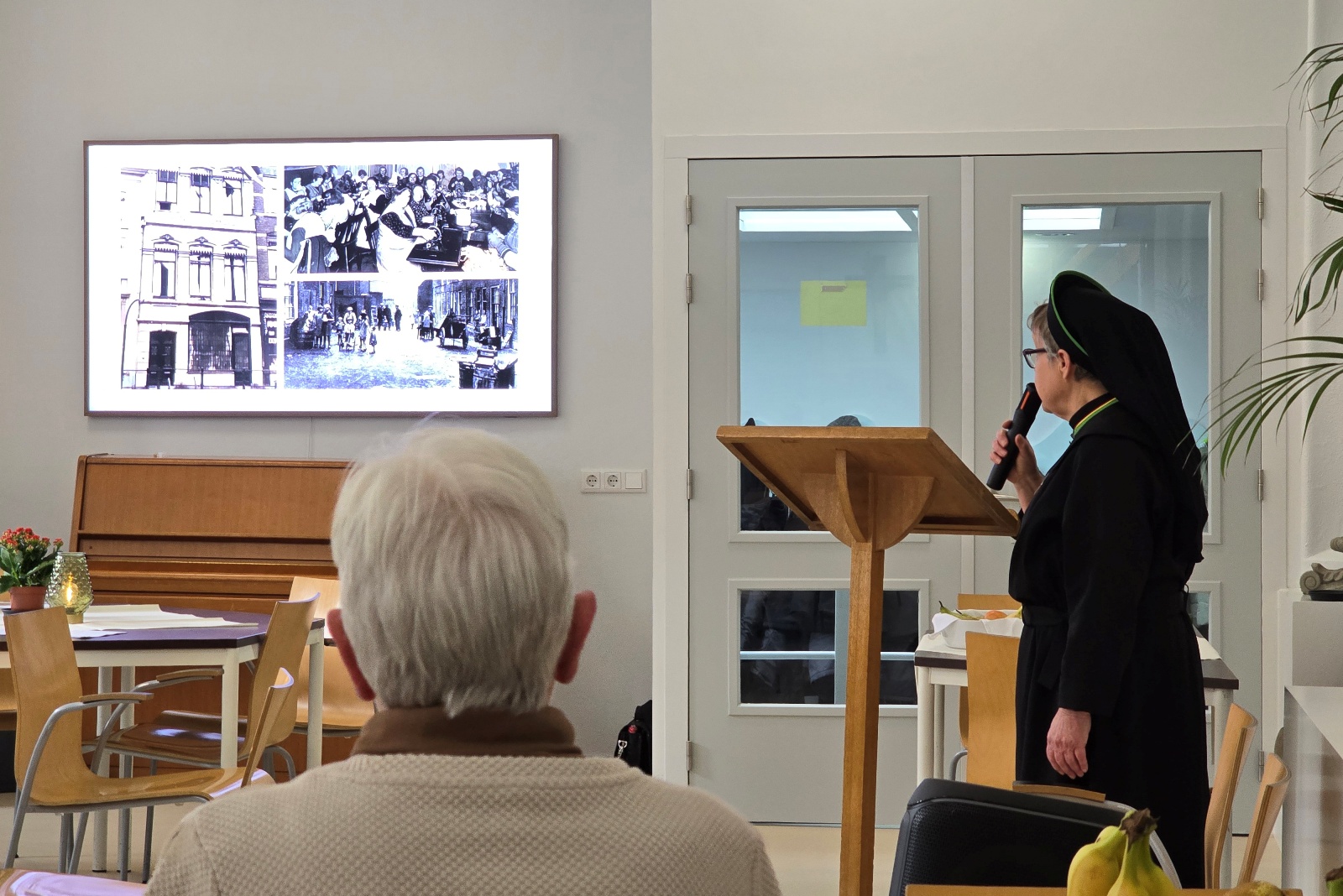 Na de lunch met erwtensoep gaf zr. Marielle osa mede aan de hand van historische foto’s een overzicht van de geschiedenis van de Congregatie Augustinessen van Sint-Monica, die in 1934 werd gesticht door de in de Utrechtse Wijk C bekende en geliefde pastoor Sebastianus Van Nuenen osa. Hij was pastoor van de St. Augustinuskerk en met zuster Augustina van Reijssen osa stichtte hij in 1934 de Congregatie van de Zusters Augustinessen van Sint-Monica. Deze congregatie is gebaseerd op de derde regel van de Augustijner orde en dankt haar naam aan de heilige Monica, de moeder van Augustinus. De congregatie telde al snel tientallen zusters die zich aanvankelijk in Utrecht maar daarna ook in Amsterdam, Hilversum (Klooster De Stad Gods), Maastricht, Sittard en Arnouville (bij Parijs) toelegden op de zorg voor arme gezinnen en allerlei vormen van sociaal werk.