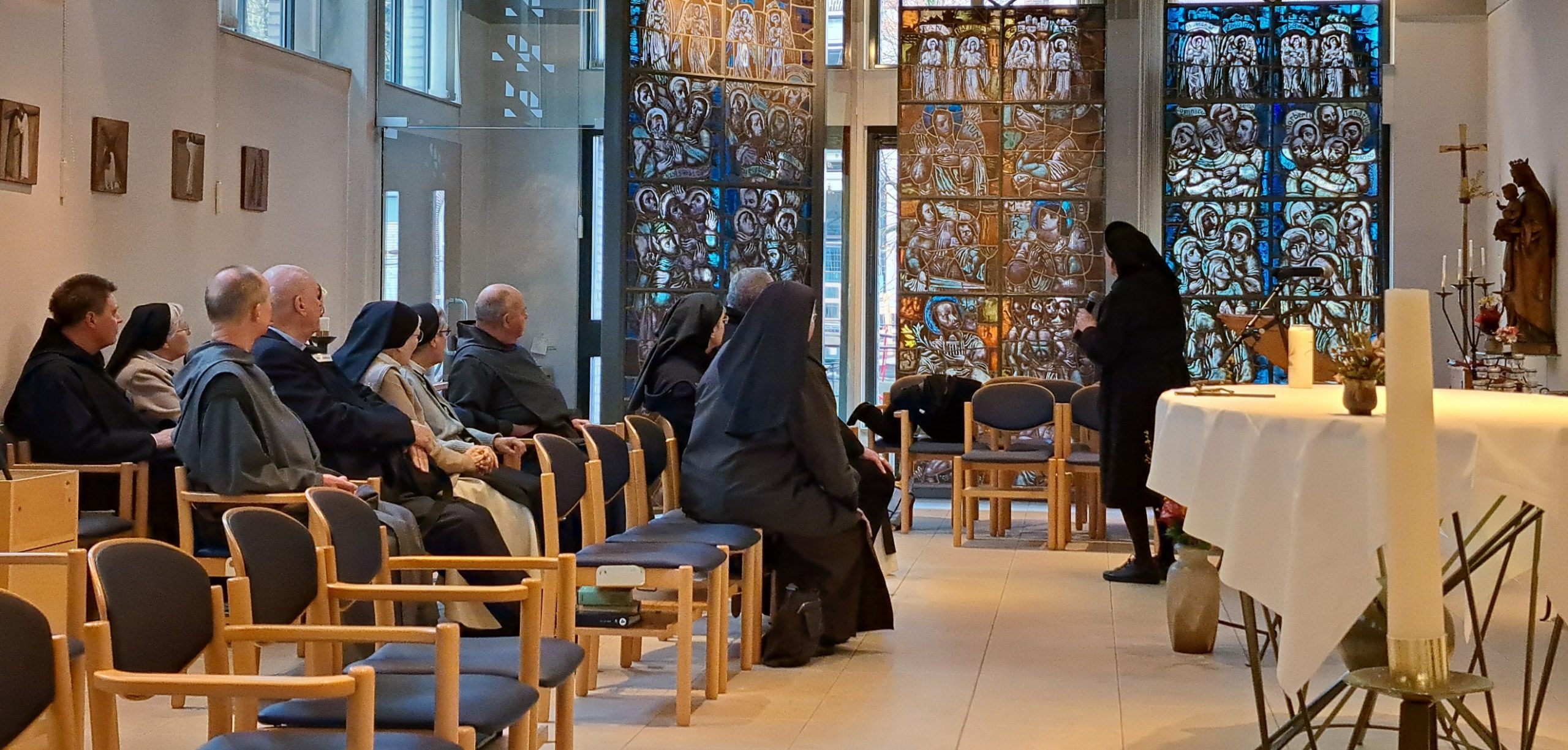 Ten slotte brachten de gasten nog een bezoek aan het klooster van de Zusters Augustinessen van Sint-Monica op de hoek Oudegracht/Waterstraat. In de mooie kloosterkapel kregen zij uitleg over de glas-in-loodramen die onder meer verwijzen naar de strijd tussen de aardse stad en de stad Gods in het beroemde werk van Augustinus ‘De Stad Gods’ en die ook verwijzen naar de geschiedenis van het Augustijnse religieuze leven. De dag werd afgesloten met het gezamenlijk bidden van het gebed na de middag.