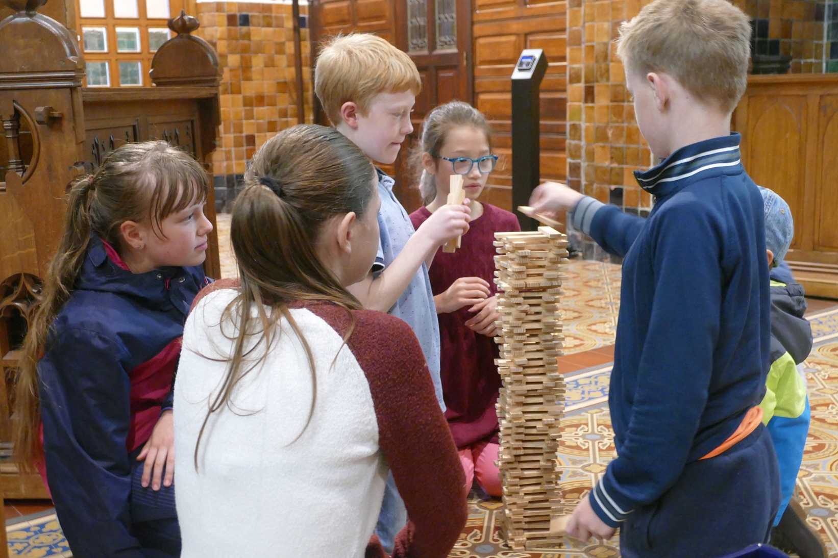 Rond 13.00 uur begon het middagprogramma. Voor de allerkleinsten was er een crèche geregeld waar ze lekker konden spelen, kleuren en knutselen. De kinderen en tieners gingen naar de kerk voor een Levend Mastermind. Ze werden in kleinere groepen opgedeeld en moesten verschillende opdrachten uitvoeren om de goede kleurcode te kraken. Zo moesten ze bijvoorbeeld vragen beantwoorden over het Oude Testament en daarbij een zo hoog mogelijke, stabiele toren bouwen. Enkele vrijwilligers van de parochie hadden dit spel voorbereid en zij begeleidden de kinderen tijdens de opdrachten.