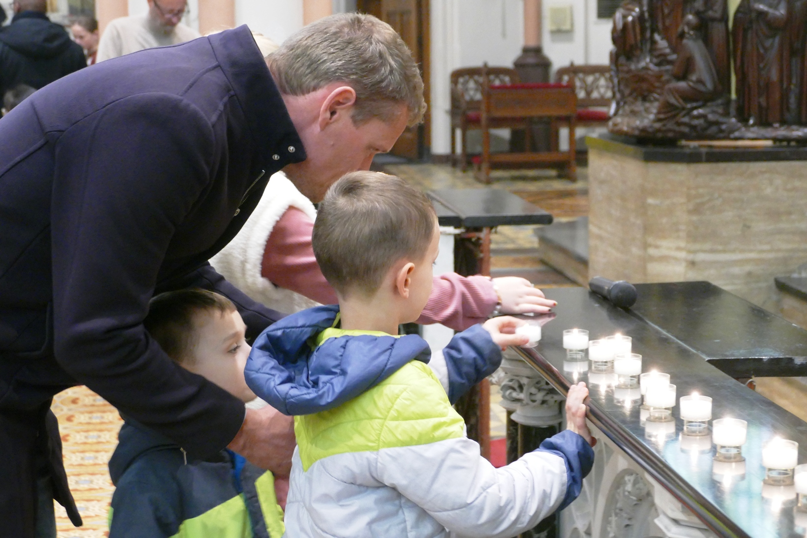 Na het inhoudelijke middagprogramma kwam iedereen weer samen in de basiliek voor de afsluiting van de dag. Er was tijd om te bidden in de aanwezigheid van het Allerheiligst Sacrament, waarbij het gebed werd begeleid door gitaar en zang. Ook konden gezinnen kaarsen aansteken en hadden ze de gelegenheid om een gezinszegen te ontvangen – daar werd dankbaar gebruik van gemaakt.
