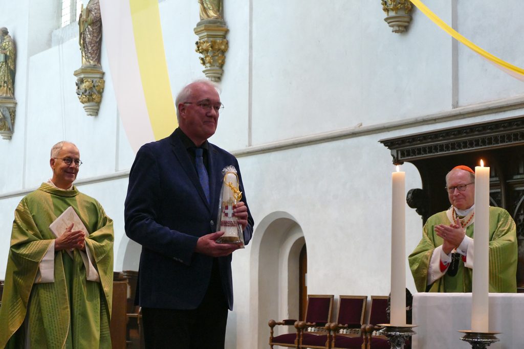 Aansluitend richtte pastoor Boogers zich tot Van Belle. Hij vertelde (mede namens het parochiebestuur, het Catharinaberaad en het Kathedrale Koor) de Willibrordplaquette voor hem te hebben aangevraagd. Deze kreeg Van Belle vervolgens uitgereikt door kardinaal Eijk, waarna hij de bijbehorende oorkonde uit handen van pastoor Boogers ontving. In zijn korte dankwoord stelde de jubilaris onder meer “geluk te hebben gehad hier organist te mogen zijn.”