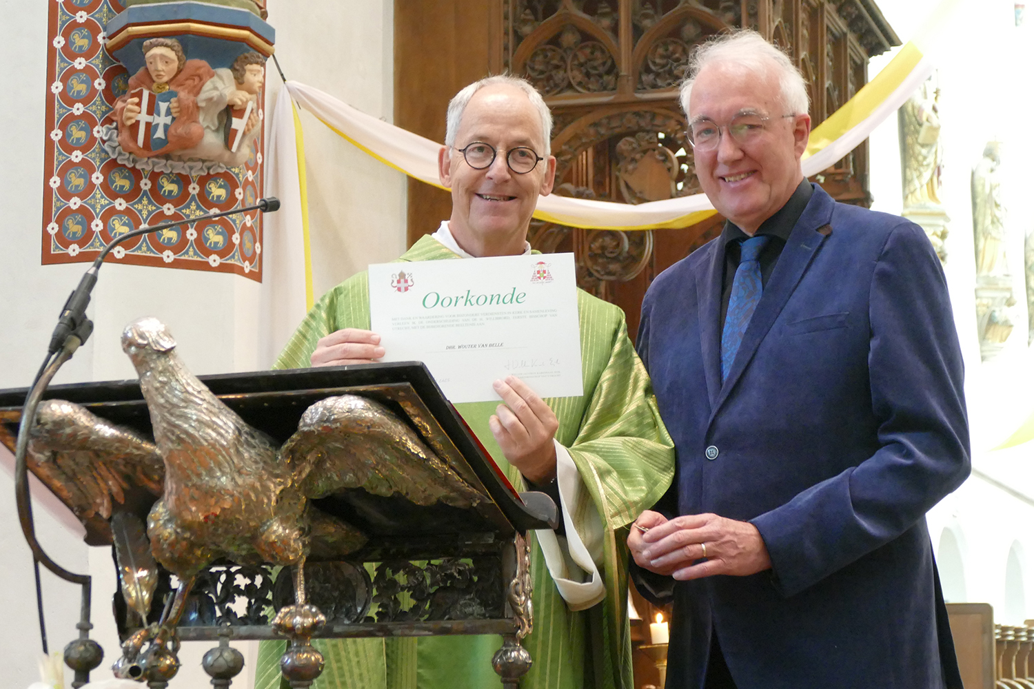 Aansluitend richtte pastoor Boogers zich tot Van Belle. Hij vertelde (mede namens het parochiebestuur, het Catharinaberaad en het Kathedrale Koor) de Willibrordplaquette voor hem te hebben aangevraagd. Deze kreeg Van Belle vervolgens uitgereikt door kardinaal Eijk, waarna hij de bijbehorende oorkonde uit handen van pastoor Boogers ontving. In zijn korte dankwoord stelde de jubilaris onder meer “geluk te hebben gehad hier organist te mogen zijn.”